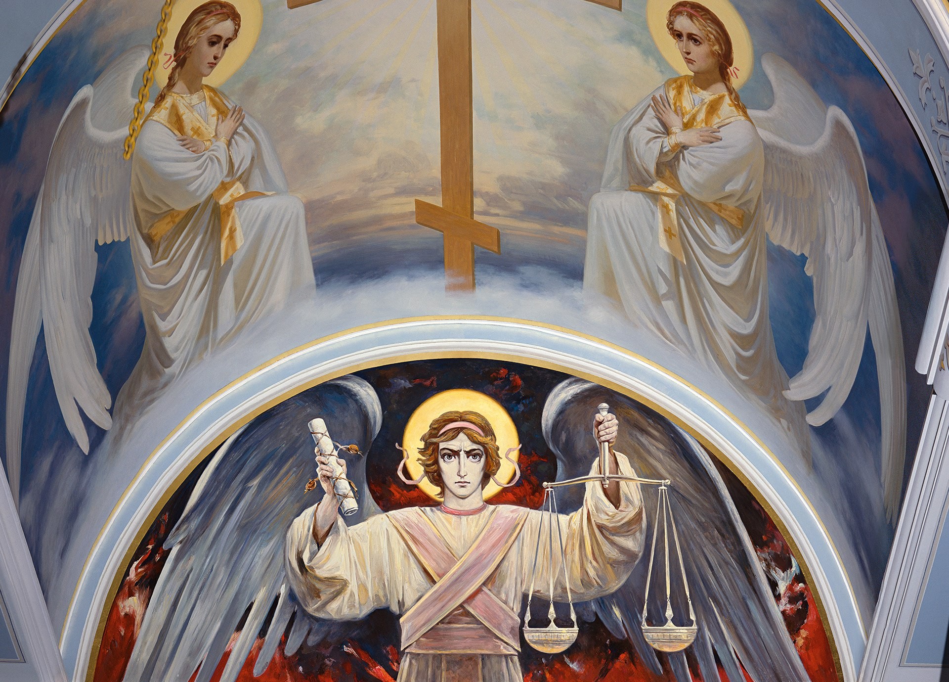 – По объёму наша задача во многом была похоже на роспись Владимирского собора в Киеве, где в XIX веке работали три художника – В.М. Васнецов, П.А. Сведомский и В.А. Котарбинский. Также принимали участие М.В. Нестеров и чуточку М.А. Врубель. Но расписан был знаменитый храм в основном тремя художниками. Именно три мастера позволяют сделать роспись как бы одной рукой. Ведь смысл храмовых росписей в том, что всё должно быть цельно. Именно состав группы из трёх художников позволяет не уходить в разные кисти, в разные творческие манеры.