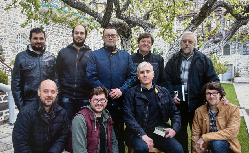 Со мной расписывали храм на Афоне два художника – Виктор Гончаров и Михаил Полетаев. Также членами нашего довольно большого коллектива были орнаменталисты и позолотчики. Главным по орнаментам был художник Владимир Павлов.
