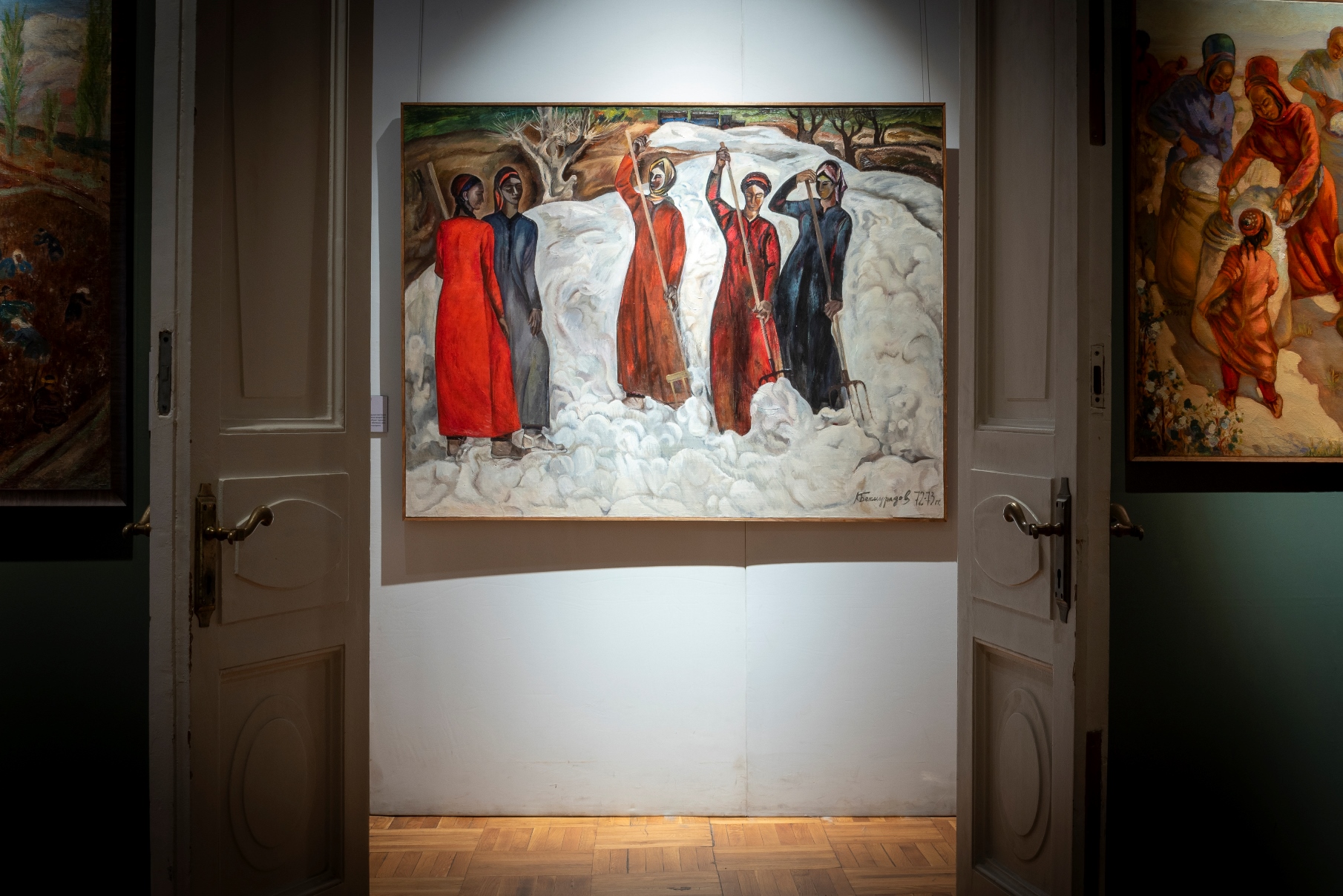 В следующем разделе представлены живописные полотна, созданные известными мастерами советского изобразительного искусства: П. Беньковым. А. Волковым, А. Николаевым, М. Курзиным, О. Соколовой, В. Боборыкиным, С. Бегляровым, Ш. Мангасаровым и др.