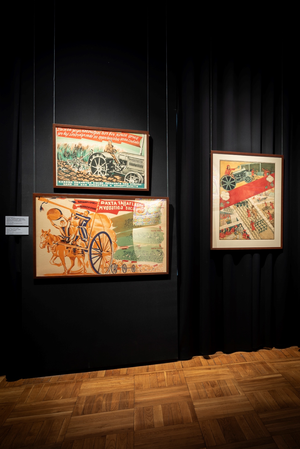 Часть выставочного пространства отдана плакатам, выполненным в 1930-1970-е гг. Кроме тиражных печатных листов здесь представлены и авторские эскизы А. Николаева, О. Соколовой, С. Беглярова – выдающихся художников, оставивших след в истории живописи республик Средней Азии.