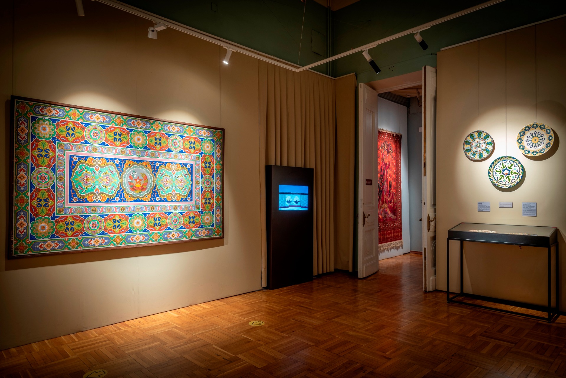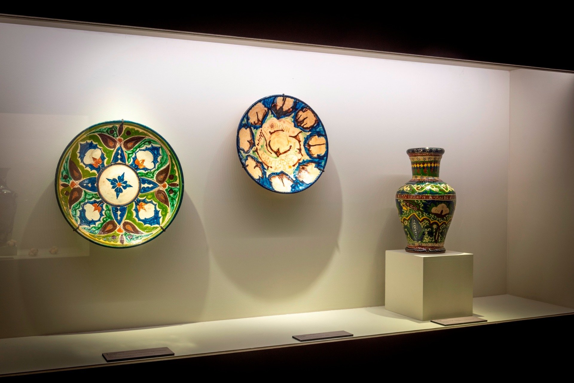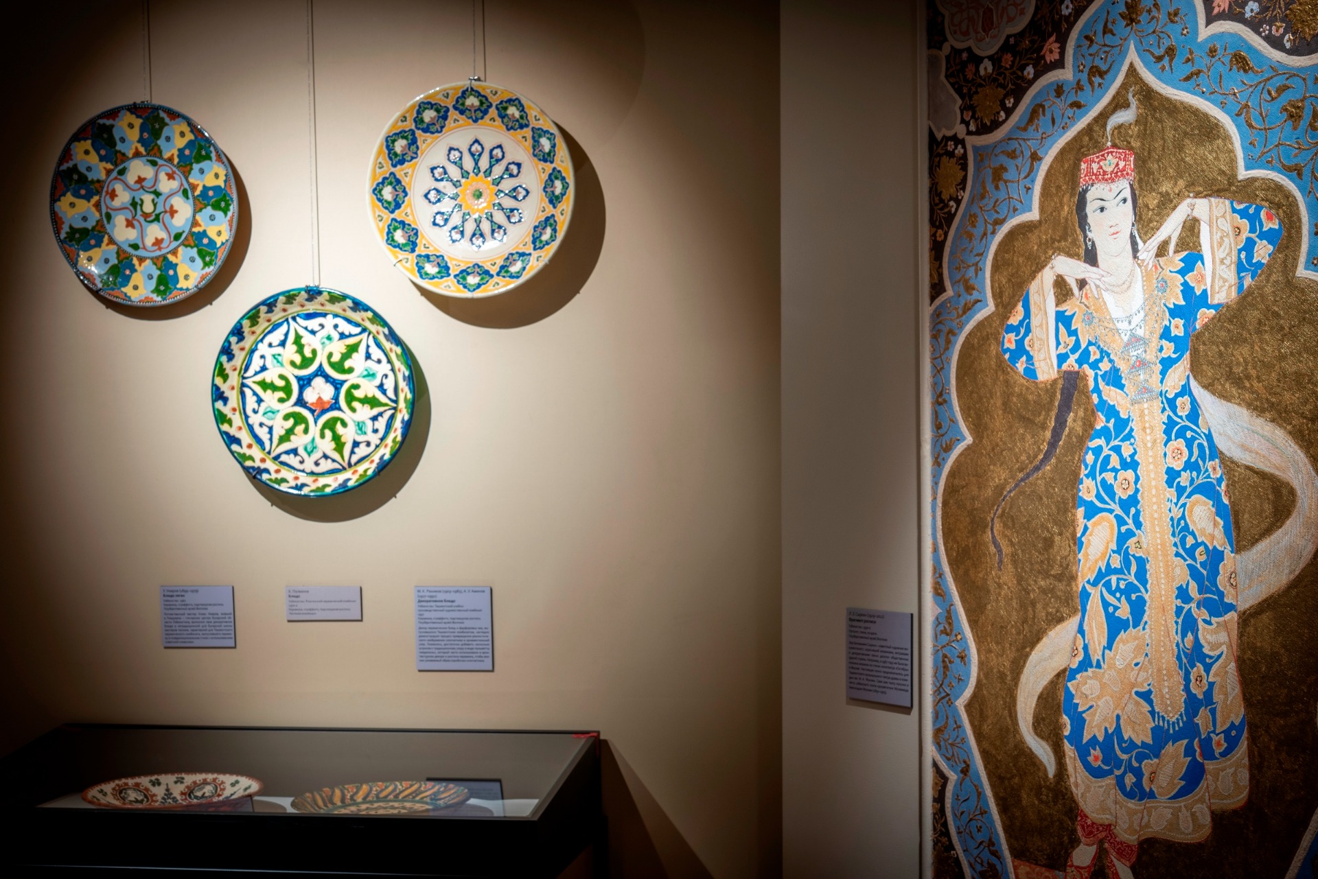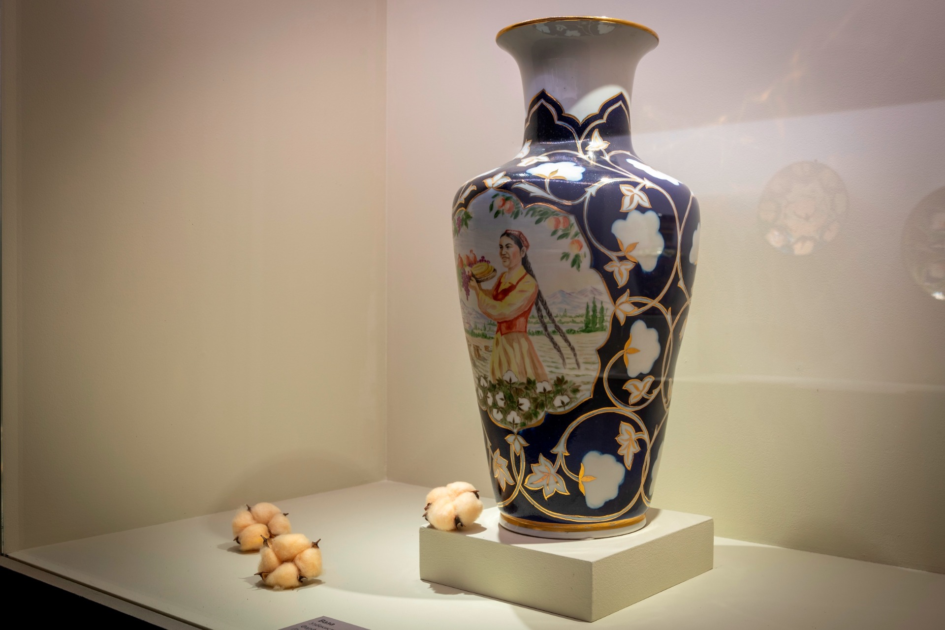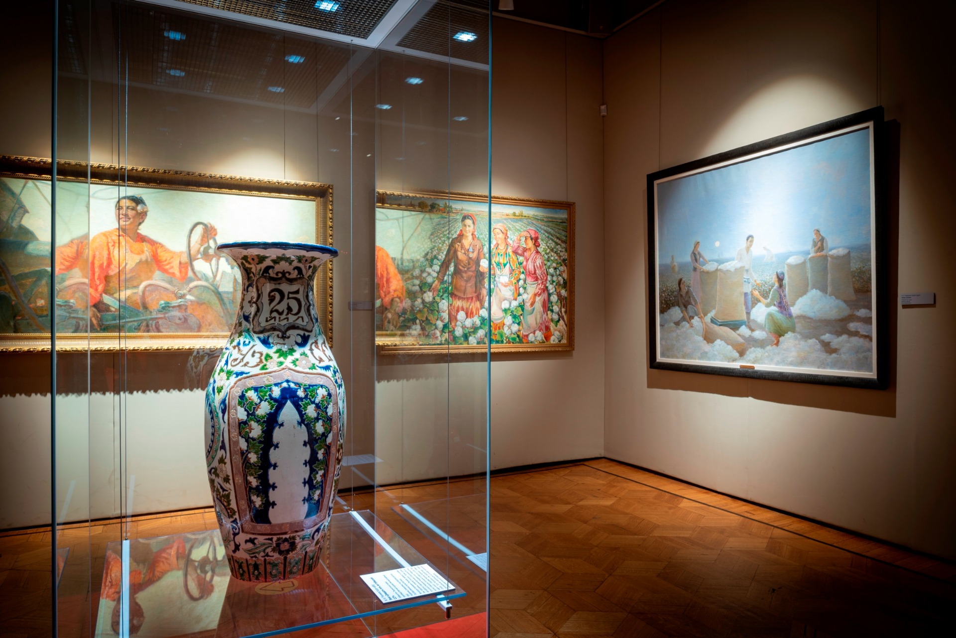 Отдельный зал демонстрирует, как изображение хлопка, украшая декоративные панно, керамические блюда, вышитые покрывала, национальные головные уборы превращалось в сакральный советский символ.