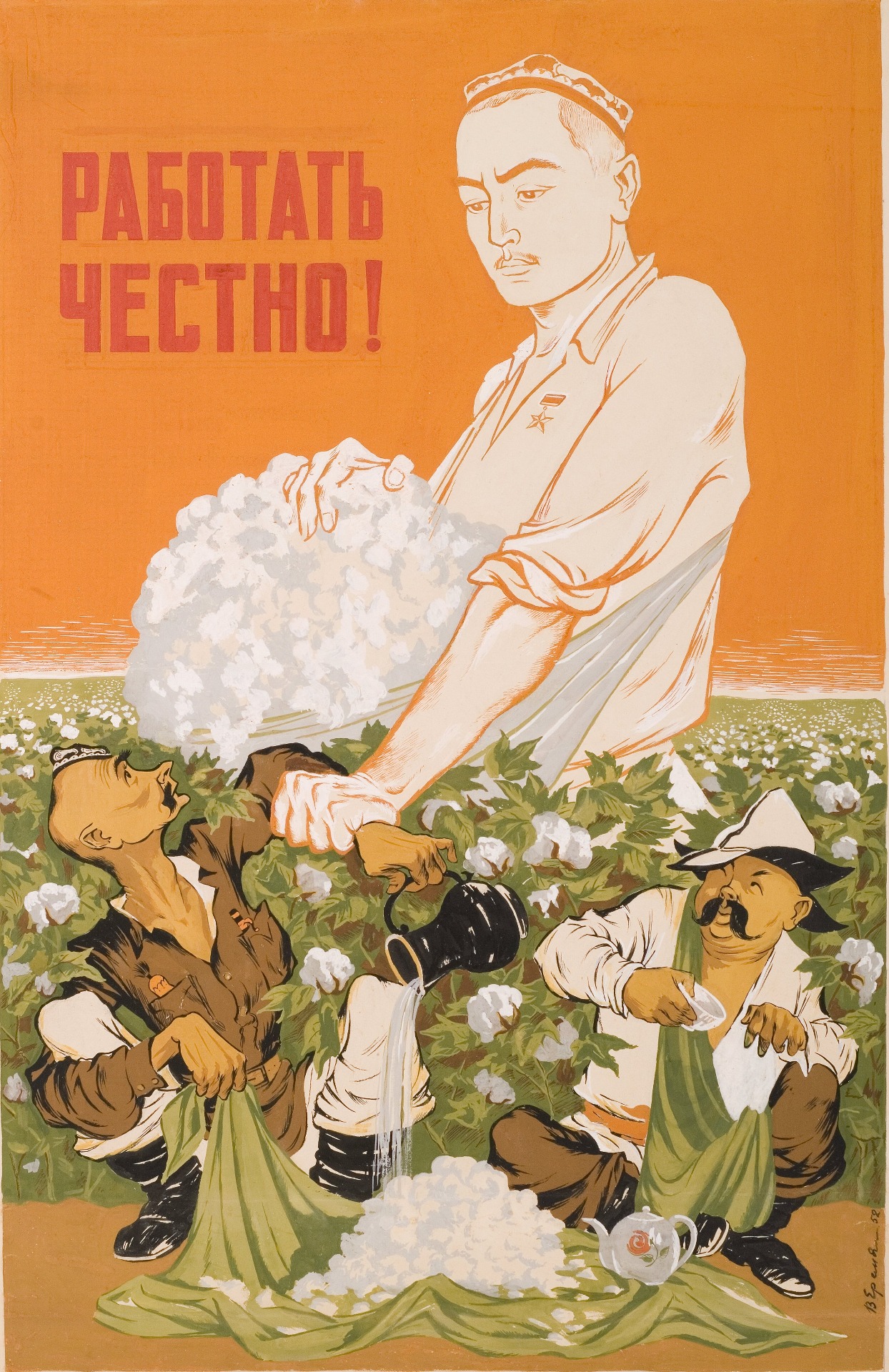 «Сложно поверить, но в традиционном орнаменте бывших союзных республик хлопковый узор еще сто лет назад отсутствовал. Однако пропаганда сумела его не просто внедрить. Он очень органично вписался в систему декоративных мотивов при оформлении архитектуры. Более того, коробочки хлопчатника появились на гербах пяти республик: Узбекистана, Таджикистана, Туркмении, Киргизии и Азербайджана», – рассказала куратор выставки Екатерина Ермакова.