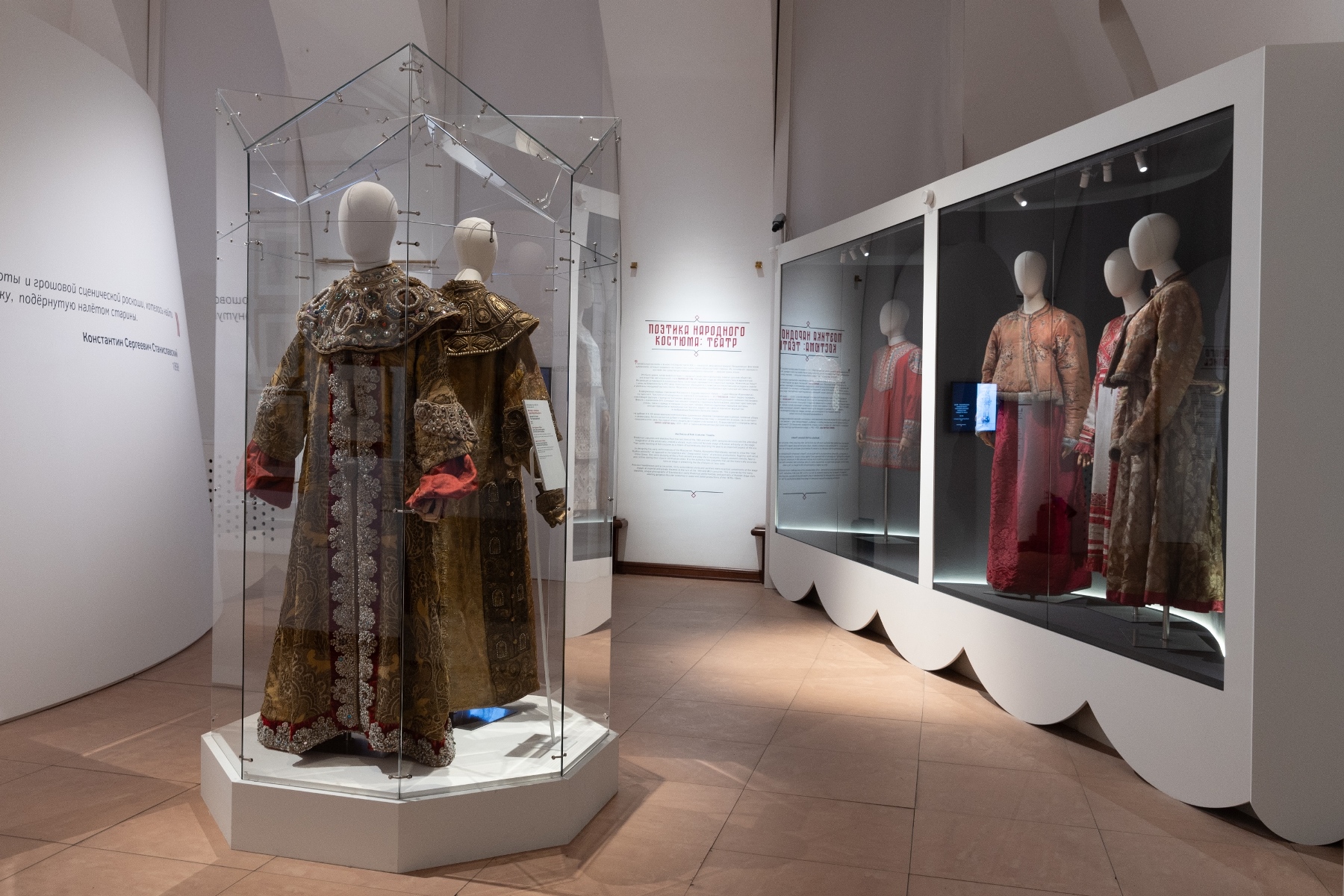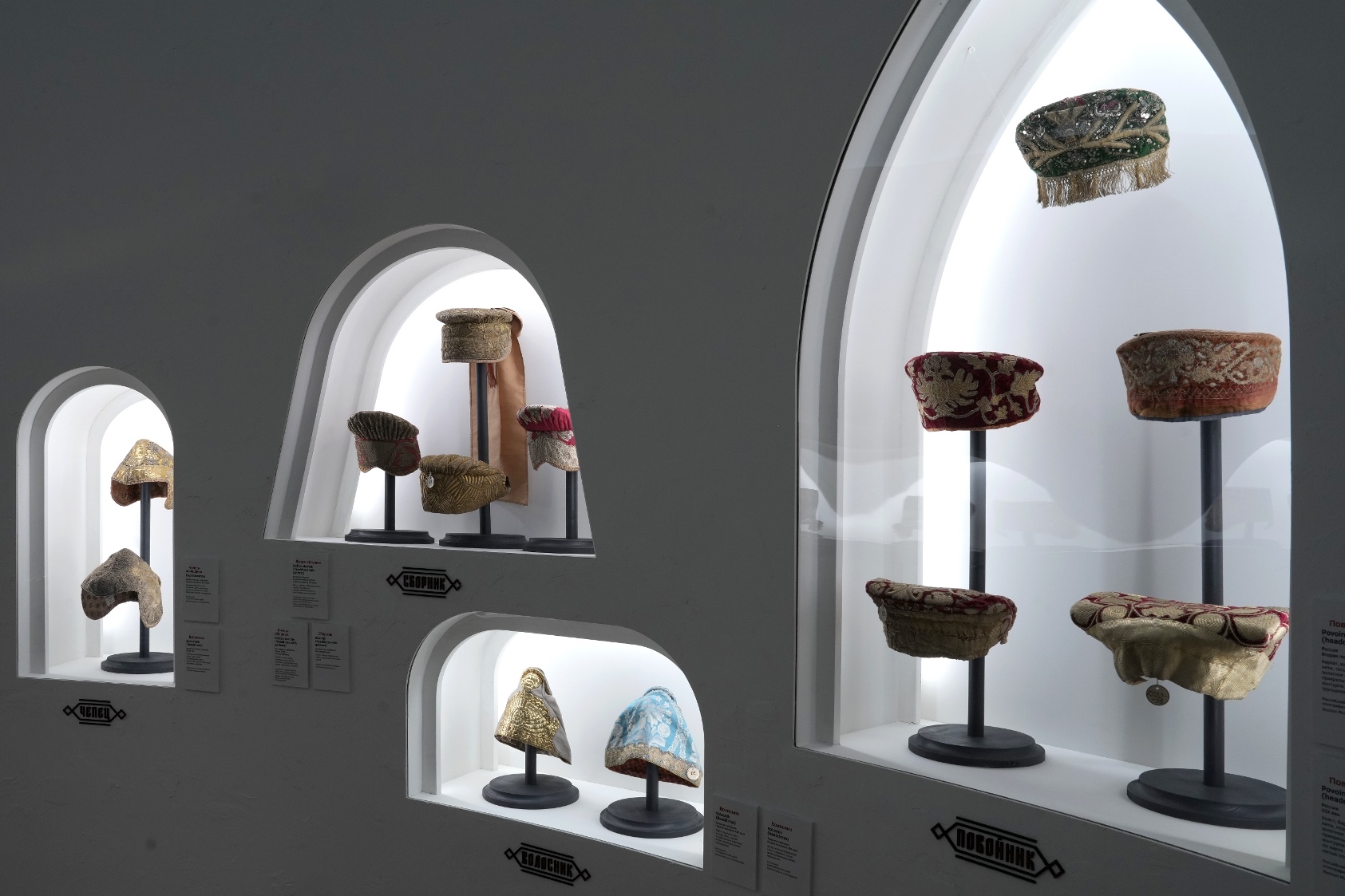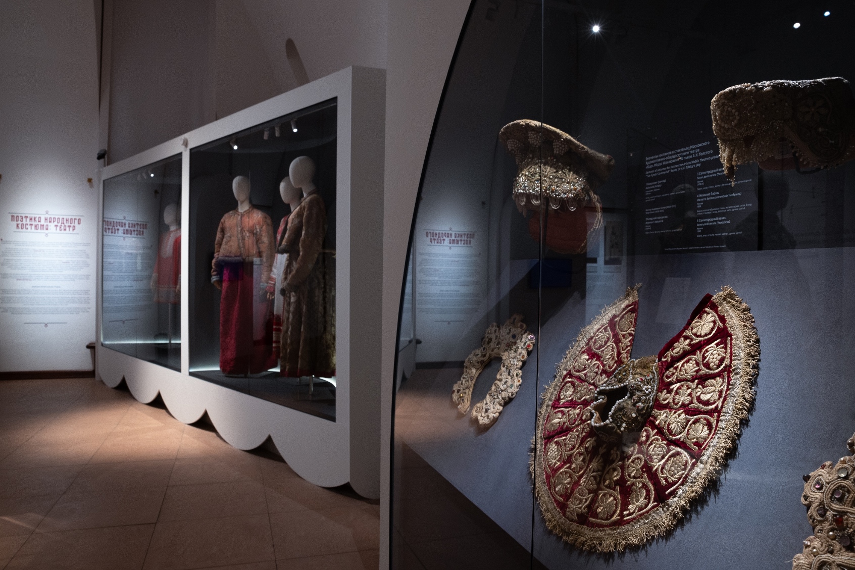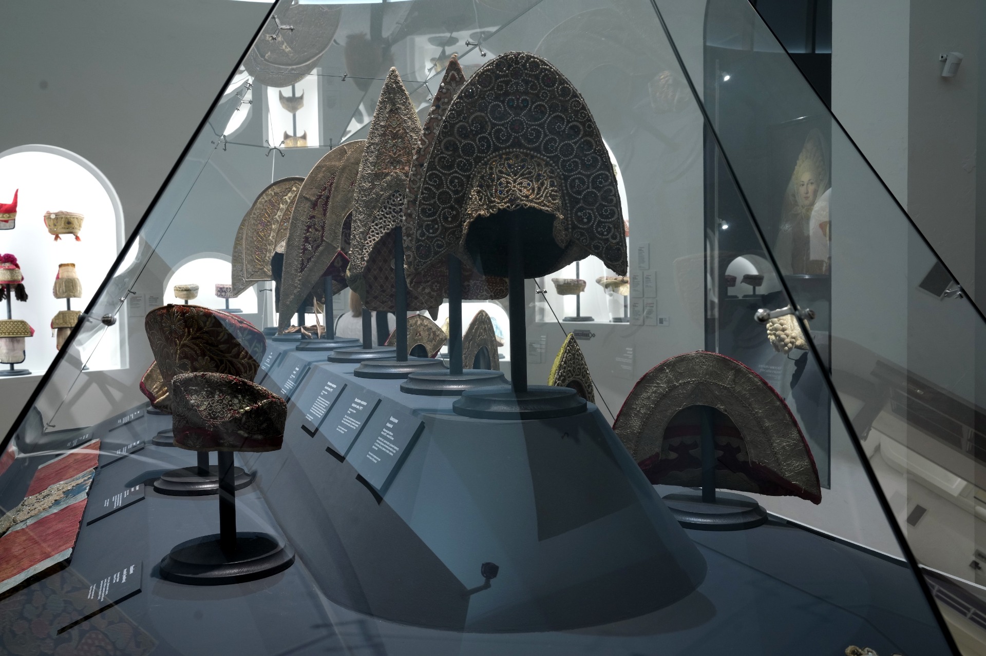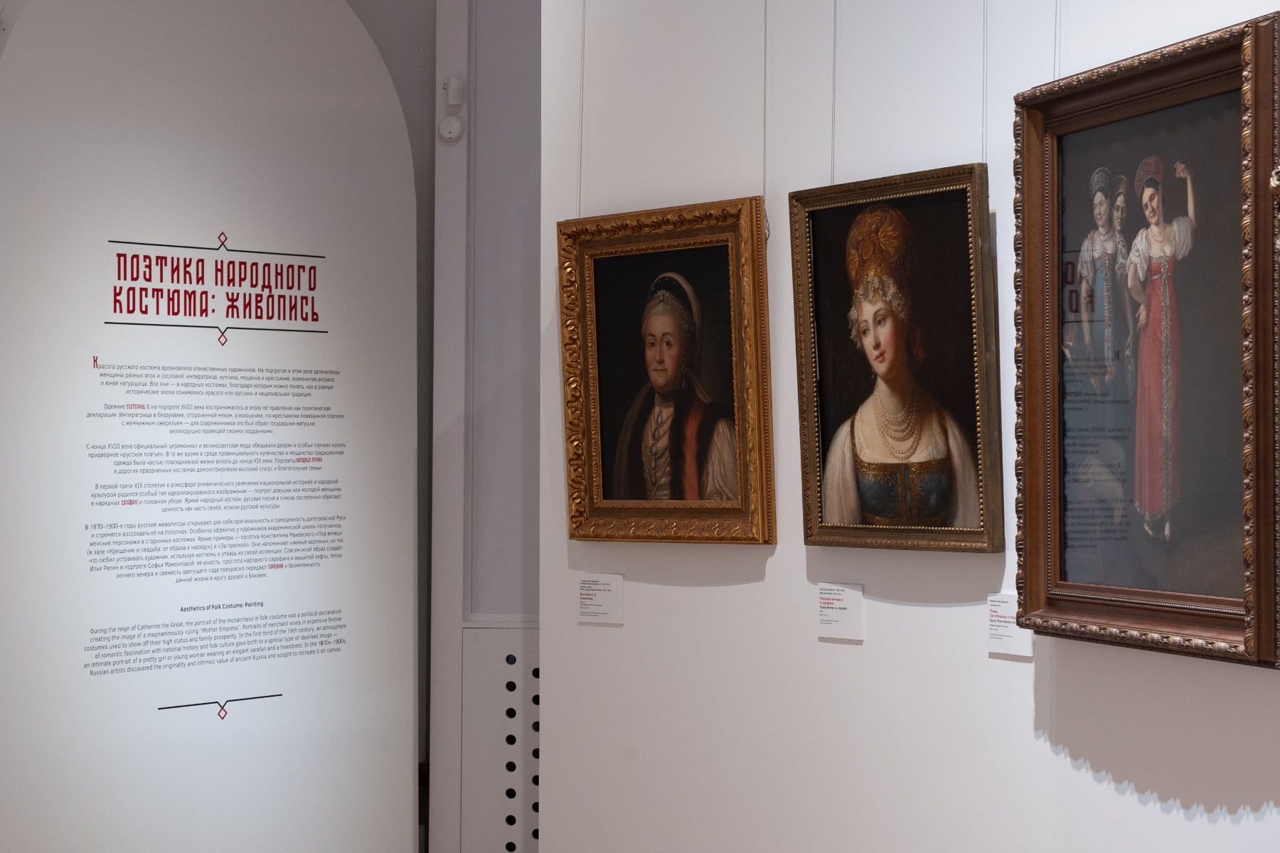 Для полного погружения в тему в зале «Красота по-русски» звучит музыка фольклорного ансамбля «Толока», участники которого уже много лет изучают нематериальное наследие и музыкальные традиции в экспедициях по русским деревням. Атмосферу отечественной культуры XIX столетия, с её ревностным поиском национальных корней, воссоздаёт зал «Поэтика народного костюма: живопись и театр». Здесь представлены полотна русских художников, театральные эскизы и костюмы. Отдельный зал «Поехали на ярмарку!» предназначен для интерактивного семейного «путешествия» по русским городам в поисках старинных головных уборов. В одном из последних залов на экране показаны фрагменты фильма Рустама Хамдамова «Мешок без дна». В центре – арт-объект со съемочной площадки, головной убор Царевны, созданный художником по костюмам Дмитрием Андреевым по мотивам старинного свадебного венца. Завершающий аккорд – зал «Новая русская старина», где можно видеть современные работы: текстиль, традиционные костюмы, украшения из жемчуга и бисера, фарфор и кукол, и даже арт-объект из вологодского кружева и металла. Каждый из мастеров по-своему переосмысляет традицию, переплавляя образы и мотивы «русской старины» в авторское художественное произведение.