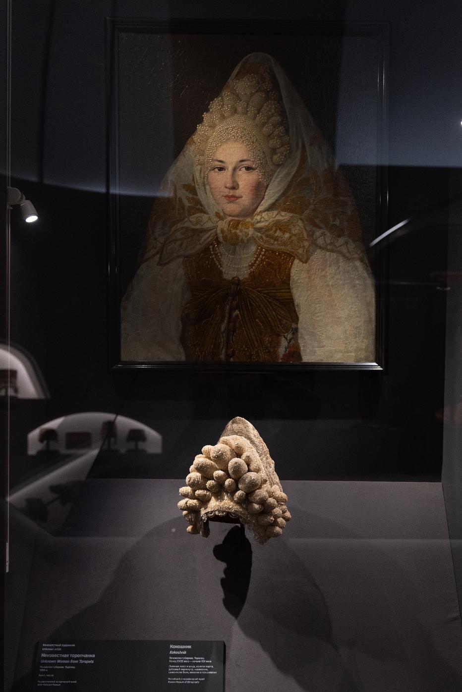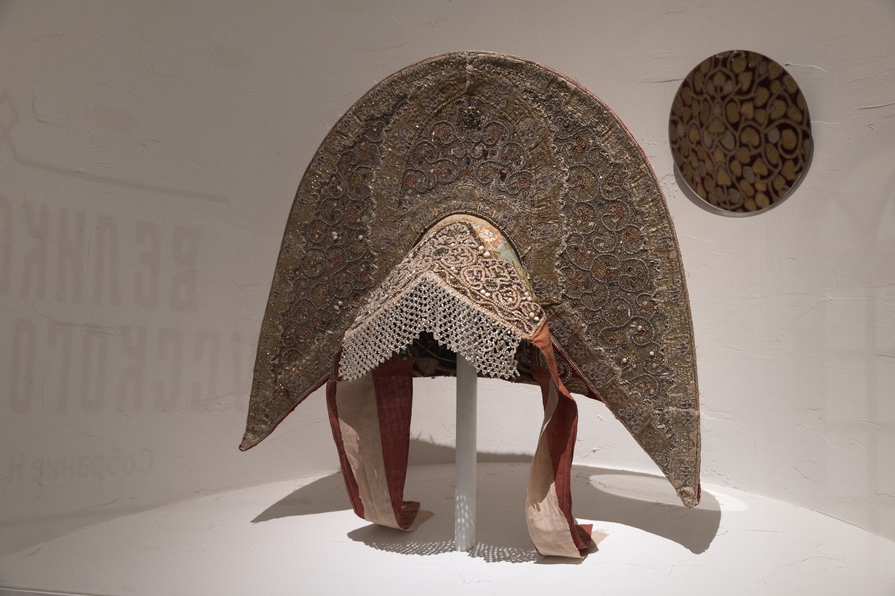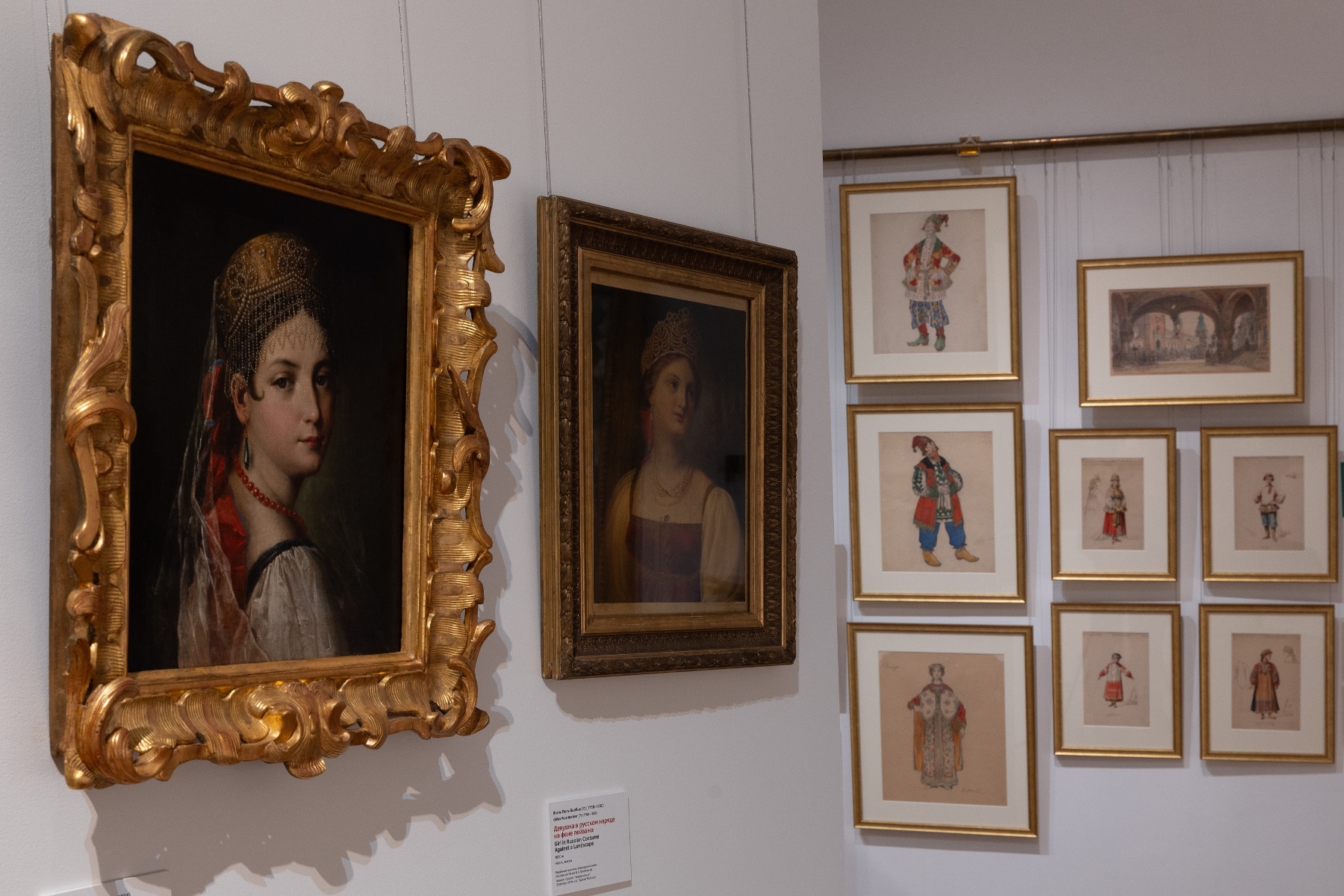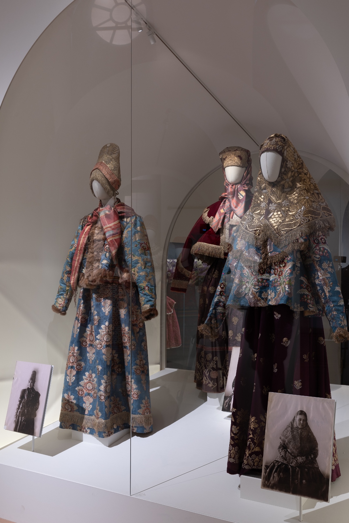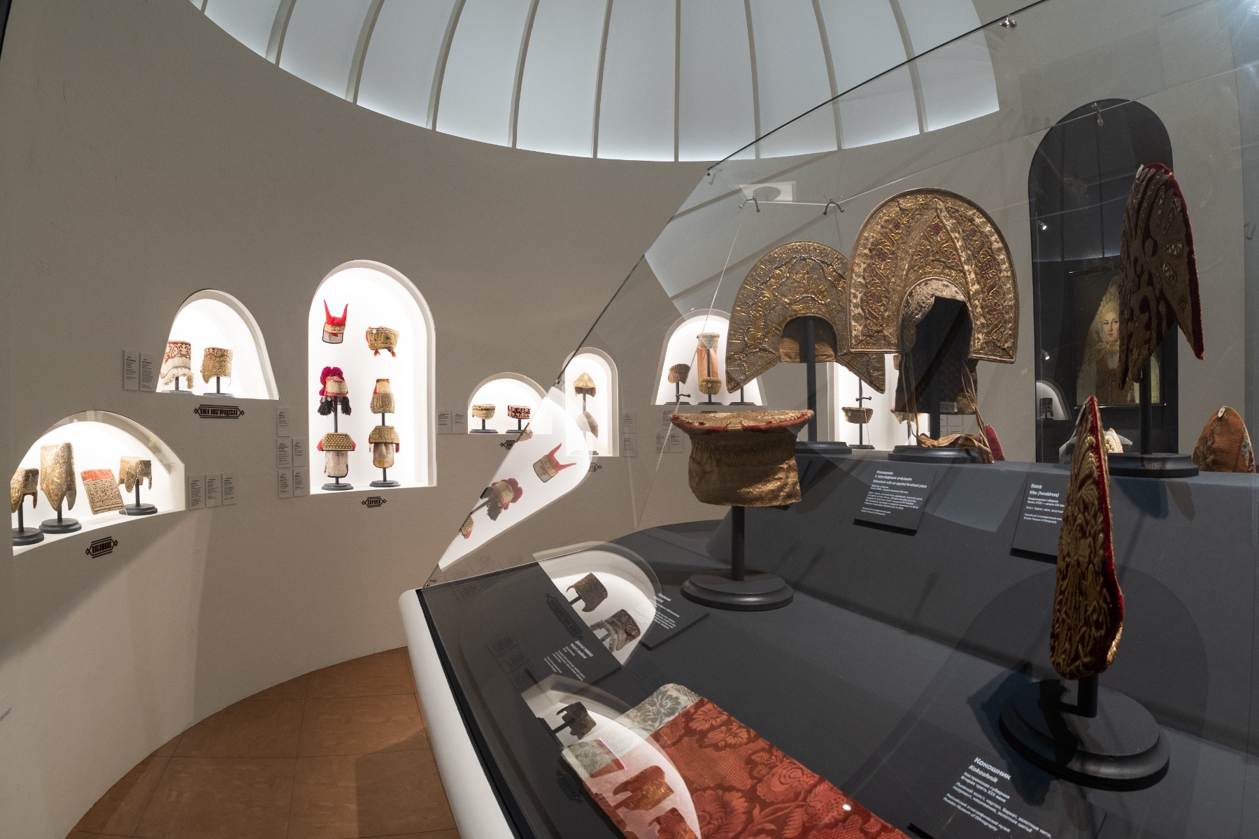 Для полного погружения в тему в зале «Красота по-русски» звучит музыка фольклорного ансамбля «Толока», участники которого уже много лет изучают нематериальное наследие и музыкальные традиции в экспедициях по русским деревням. Атмосферу отечественной культуры XIX столетия, с её ревностным поиском национальных корней, воссоздаёт зал «Поэтика народного костюма: живопись и театр». Здесь представлены полотна русских художников, театральные эскизы и костюмы. Отдельный зал «Поехали на ярмарку!» предназначен для интерактивного семейного «путешествия» по русским городам в поисках старинных головных уборов. В одном из последних залов на экране показаны фрагменты фильма Рустама Хамдамова «Мешок без дна». В центре – арт-объект со съемочной площадки, головной убор Царевны, созданный художником по костюмам Дмитрием Андреевым по мотивам старинного свадебного венца. Завершающий аккорд – зал «Новая русская старина», где можно видеть современные работы: текстиль, традиционные костюмы, украшения из жемчуга и бисера, фарфор и кукол, и даже арт-объект из вологодского кружева и металла. Каждый из мастеров по-своему переосмысляет традицию, переплавляя образы и мотивы «русской старины» в авторское художественное произведение.
