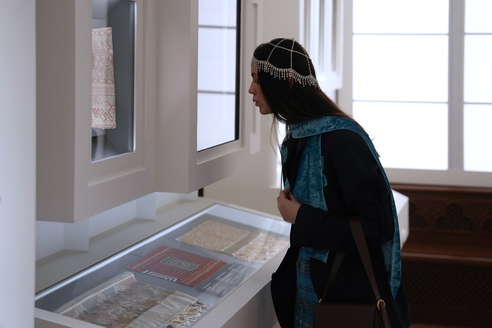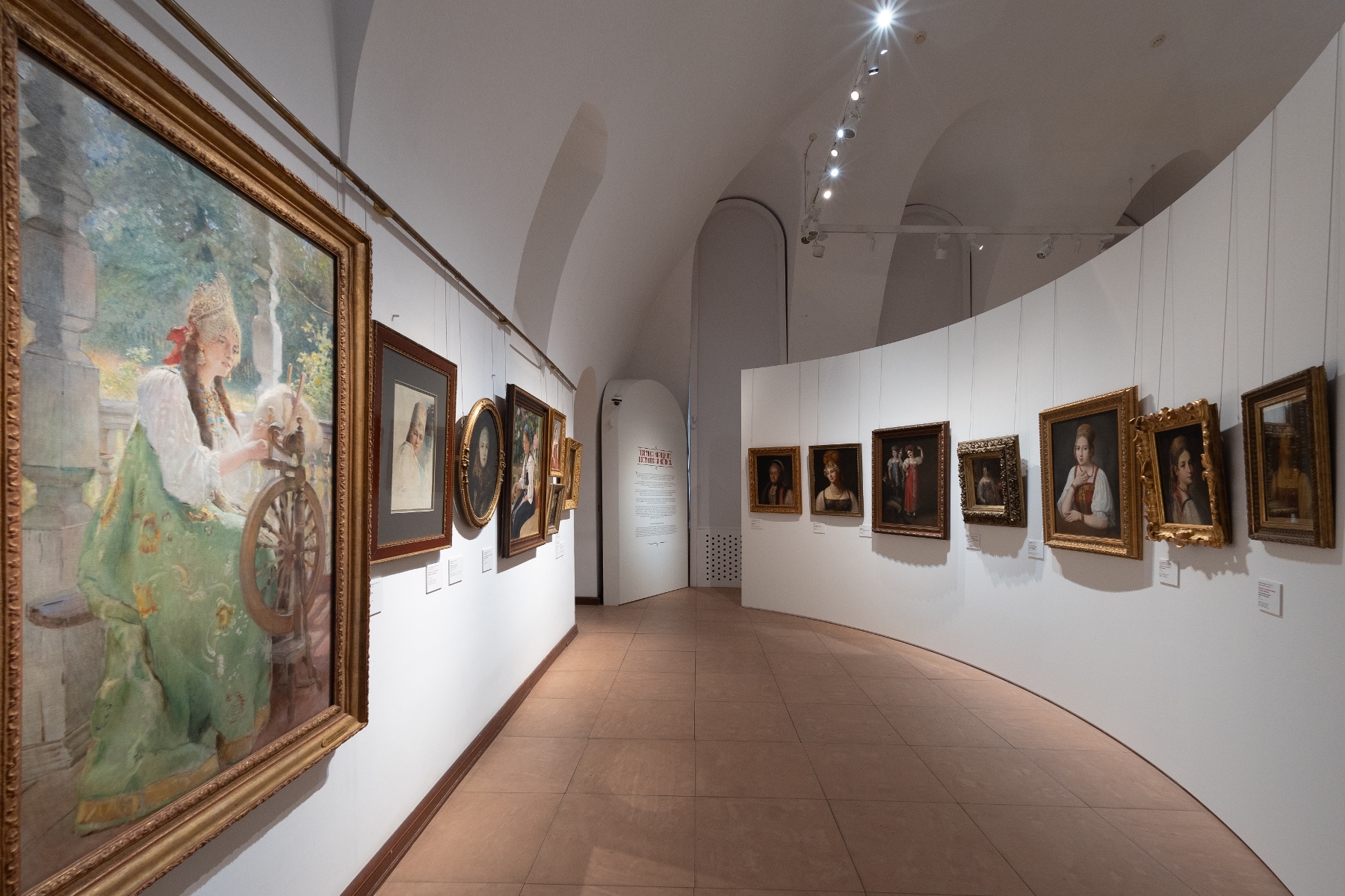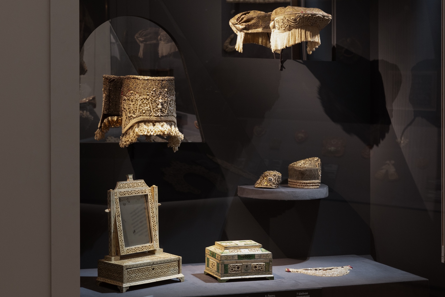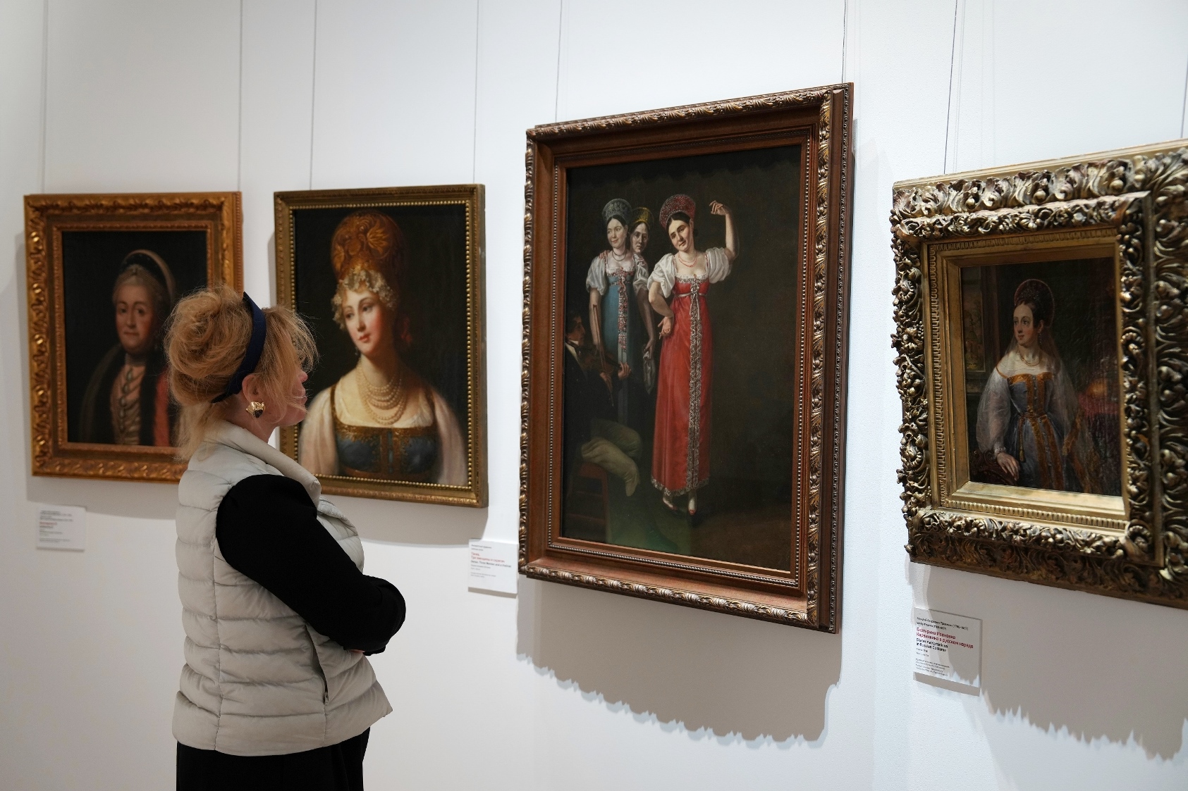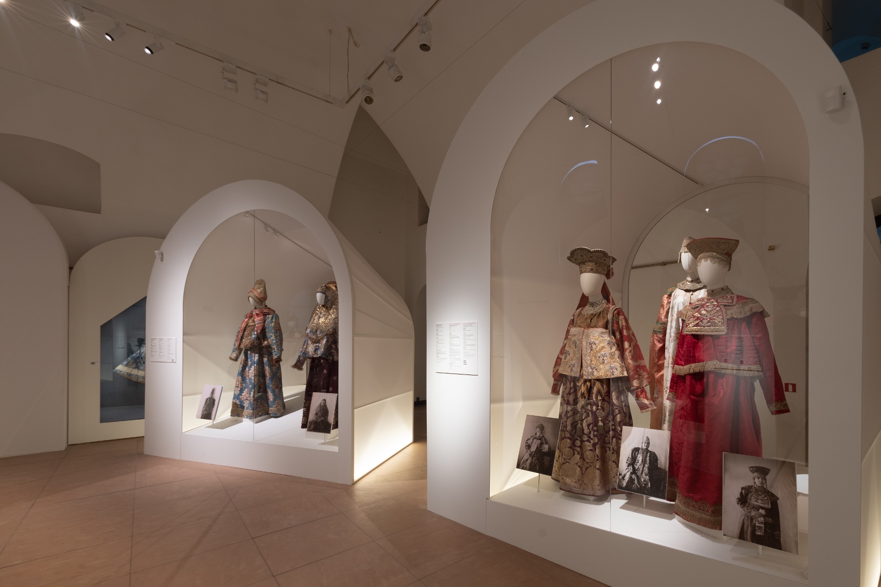 Для полного погружения в тему в зале «Красота по-русски» звучит музыка фольклорного ансамбля «Толока», участники которого уже много лет изучают нематериальное наследие и музыкальные традиции в экспедициях по русским деревням. Атмосферу отечественной культуры XIX столетия, с её ревностным поиском национальных корней, воссоздаёт зал «Поэтика народного костюма: живопись и театр». Здесь представлены полотна русских художников, театральные эскизы и костюмы. Отдельный зал «Поехали на ярмарку!» предназначен для интерактивного семейного «путешествия» по русским городам в поисках старинных головных уборов. В одном из последних залов на экране показаны фрагменты фильма Рустама Хамдамова «Мешок без дна». В центре – арт-объект со съемочной площадки, головной убор Царевны, созданный художником по костюмам Дмитрием Андреевым по мотивам старинного свадебного венца. Завершающий аккорд – зал «Новая русская старина», где можно видеть современные работы: текстиль, традиционные костюмы, украшения из жемчуга и бисера, фарфор и кукол, и даже арт-объект из вологодского кружева и металла. Каждый из мастеров по-своему переосмысляет традицию, переплавляя образы и мотивы «русской старины» в авторское художественное произведение.