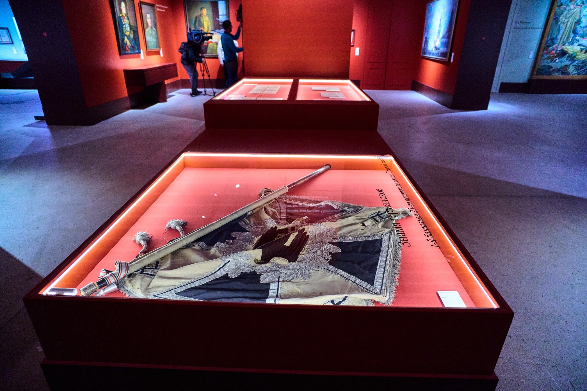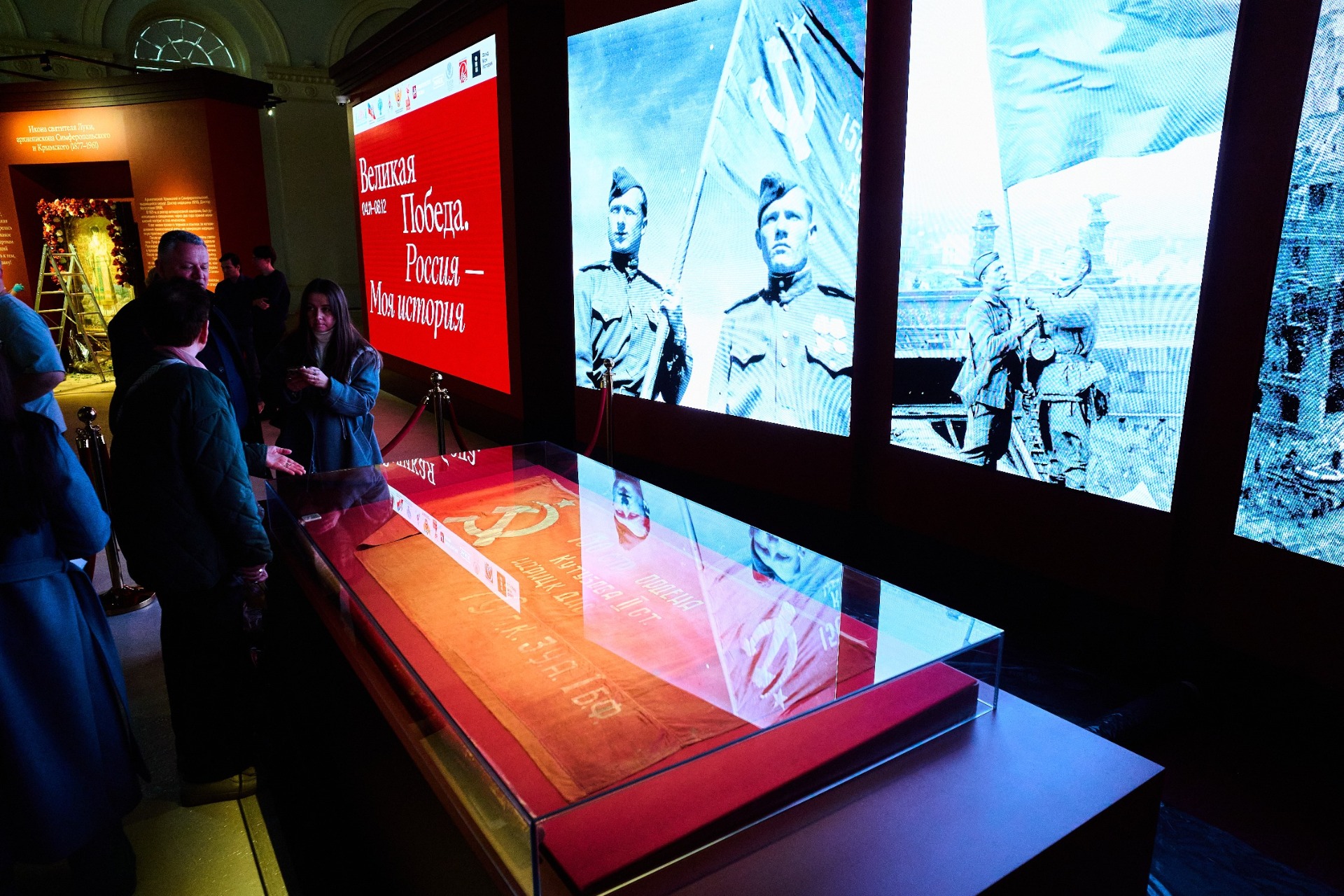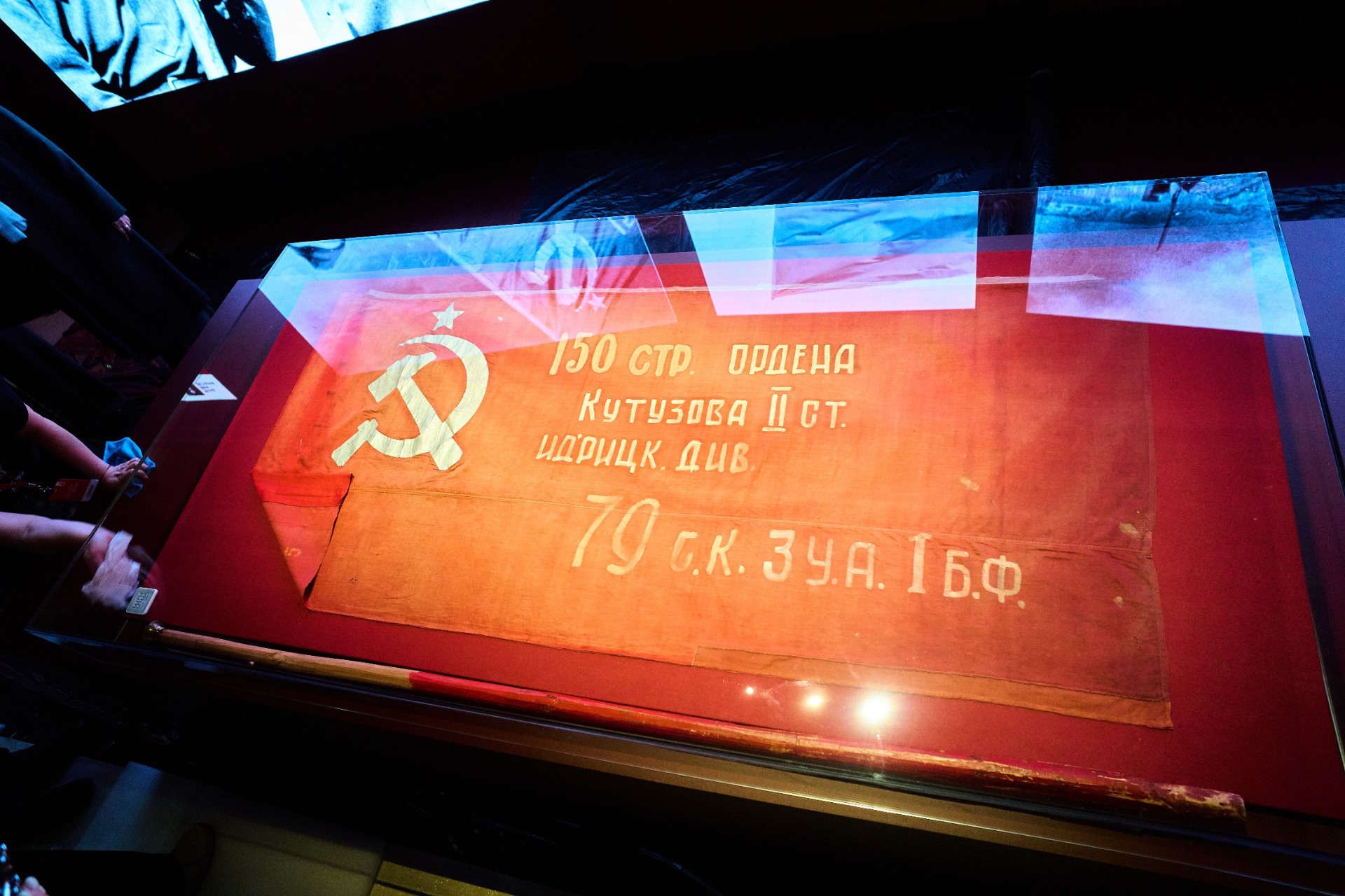 Один из главных экспонатов — Знамя Победы, водруженное над поверженным Рейхстагом. Здесь же можно видеть написанный от руки текст обращения по радио наркома иностранных дел СССР Вячеслава Молотова к населению Советского Союза 22 июня 1941 года о начале войны. Последние слова в нем известны сегодня каждому: «Наше дело правое. Враг будет разбит. Победа будет за нами».