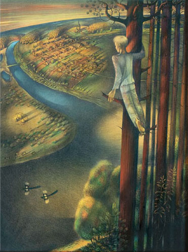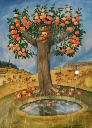 Ну а книжная иллюстрация – стихия Сергея Сюхина, на этом Лукоморье он, как рыба в воде. Зачином к выставочным экспонатам – картина «Моя деревня», где мальчик, взобравшись на высоченную сосну, обозревает родную округу. Это Сергей-подросток, это ему однажды открылась с высоты птичьего полета диво-дивное, средь которого раскинулась его деревушка. Именно тогда в нем проснулся художник, а пережитой восторг навсегда стал жизненным камертоном. На выставке экспонируются иллюстрации к сборнику «Палей и Люлех» («Детская литература»,1989), где под одной обложкой собраны сказы Павла Бажова, Степана Писахова, Бориса Шергина, Михаила Кочнева, Евгения Пермяка. Главный художник издательства Борис Диодоров тогда уже просто отчаялся найти иллюстратора для этих сказов, когда явился к нему художник с Севера.