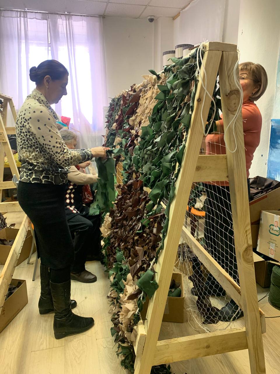 Те звуки, по которым Валентина нашла комнату, где плетутся камуфляжные сети для фронта, получаются, когда большие рулоны ткани разрывают на полосы. Того, кто рвёт ткань, в шутку окрестили «рвачом». А полосы – «рвакля» – потом нарезаются определённым образом. Находится импровизированная мастерская в городском Культурном центре «Октябрь» и составляет с пунктом приёма гуманитарной помощи одно целое. Спасибо директору Елене Викторовне Плыкиной за приют. Приходят сюда работать разные жители города – родители с детьми, бабушки, у которых больше свободного времени, люди разных возрастов и профессий. Кто-то забежал на час, пока внучка занимается в музыкальной школе неподалёку, кто-то приходит постоянно часа на 2-3. Кто-то, как Надежда Борисовна Булкина, преподаватель колледжа, кроме того, что плетёт сети, шьёт дома маскировочные плащи. «Спасибо советской школе. Научили на уроках труда пользоваться швейной машинкой», – говорит Надежда Борисовна. Интересно, а сейчас девочек этому в школах обучают? Добровольные помощники приносят с собой пустые консервные банки, они годятся для окопных свечей. Некоторые добровольцы установили в своих подъездах коробки для сбора банок и соседи их постоянно пополняют.
