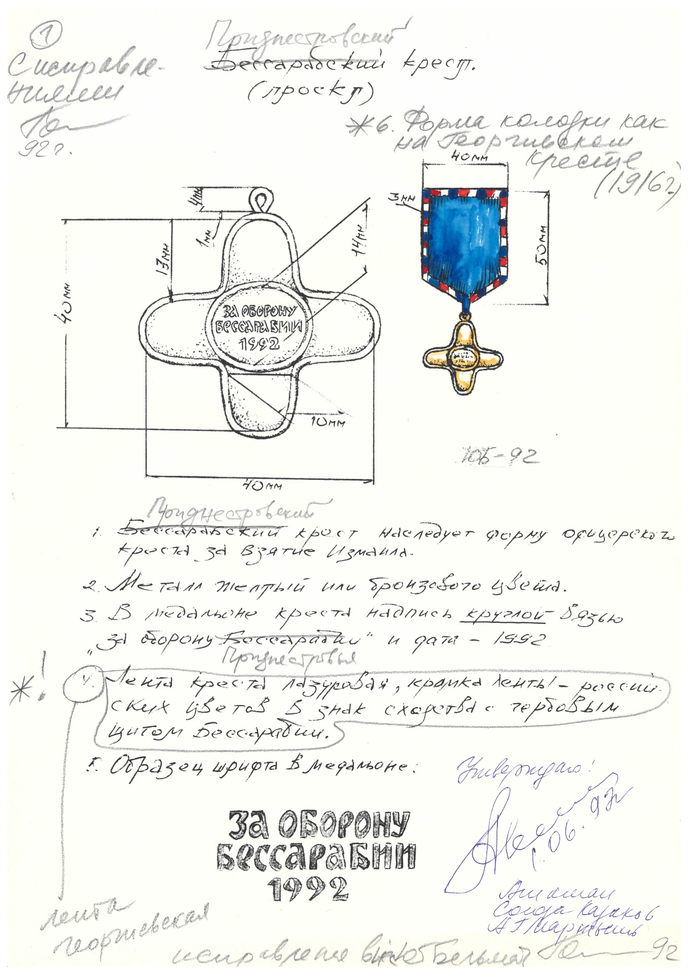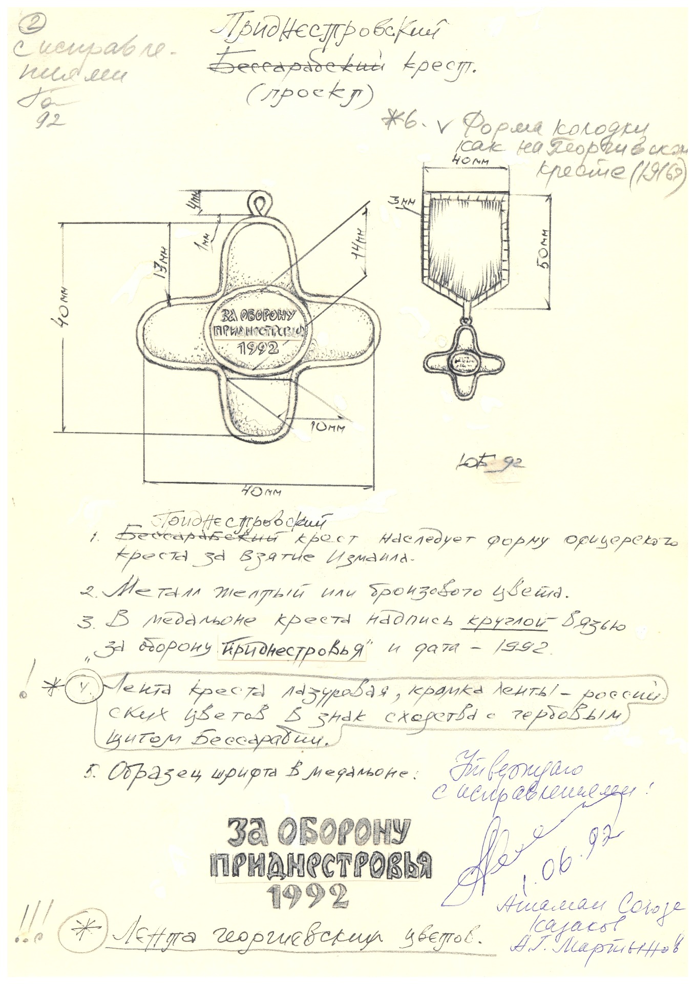 С художником, нарисовавшим эскиз креста «За оборону Приднестровья», Юрием Георгиевичем Бельмачем (1958–2025)*, автор познакомился на конференции «Казачество накануне и в годы Великой войны (1914–1918 гг.)» в январе 2024 года. Такие знакомства бывают в жизни нечасто. Авторство многих наград традиционно остаётся неизвестным для исследователей. А у Юрия Георгиевича сохранились эскизы креста с поправками.